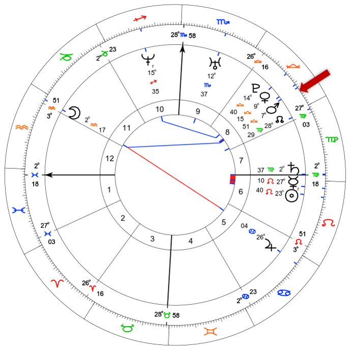 Eso sí, antes de terminar y a modo de juego (mis consultantes no tienen más remedio que aceptar mis desvaríos); le leo el monómero de Borelli para el paso de seis a siete grados de Libra, representado en el diagrama con la flecha en rojo. Se calcula una simple Dirección Primaria avanzando el Sol un grado por año en el sentido del Zodíaco para emitir una historia particular a la que el nativo asistirá en el año que está por venir, es decir entre el 2019 y el 2020: